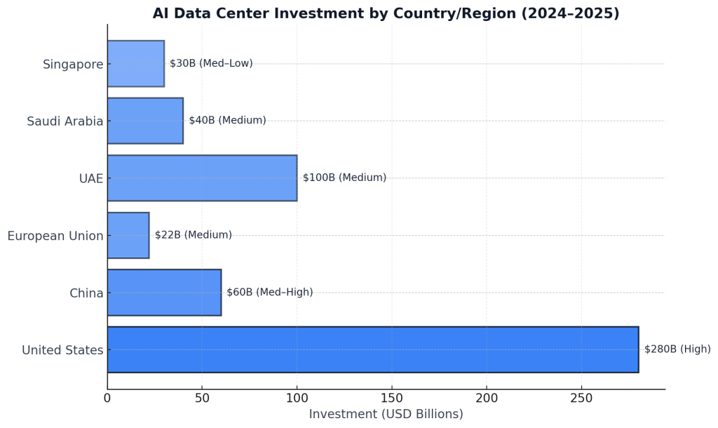 - The United States is leading with sheer capital scale over $280 billion projected in AI data center investment, supported by private sector dominance and hyperscaler muscle.