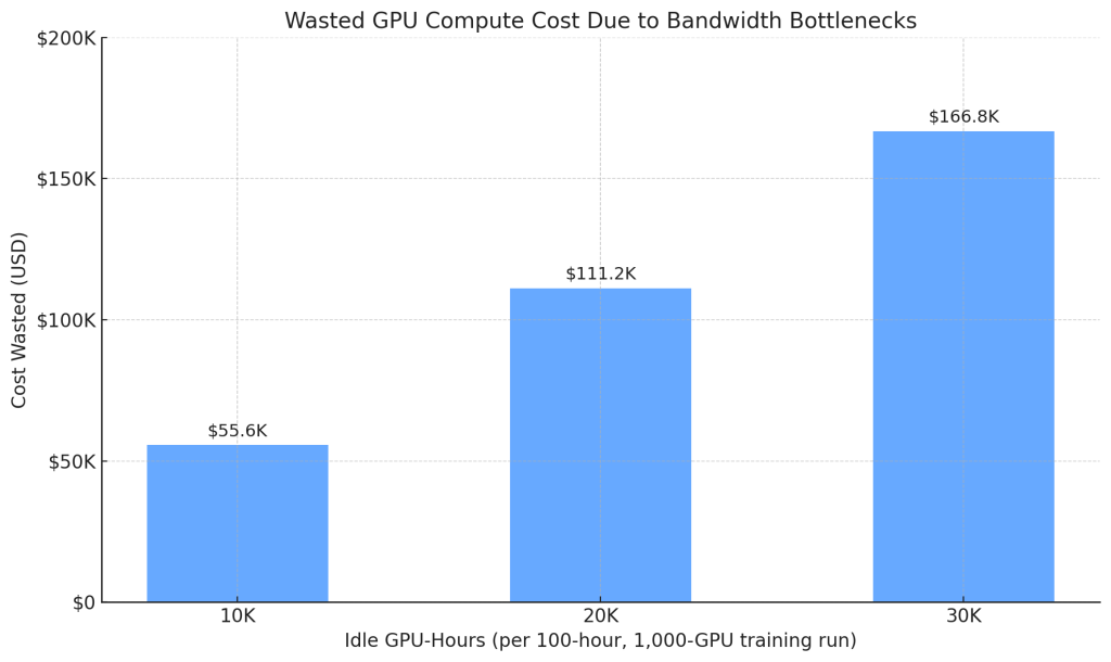 Memory and networking delays during AI training can waste tens of thousands of GPU-hours even 10–30% idle time can cost over $160K per run.
