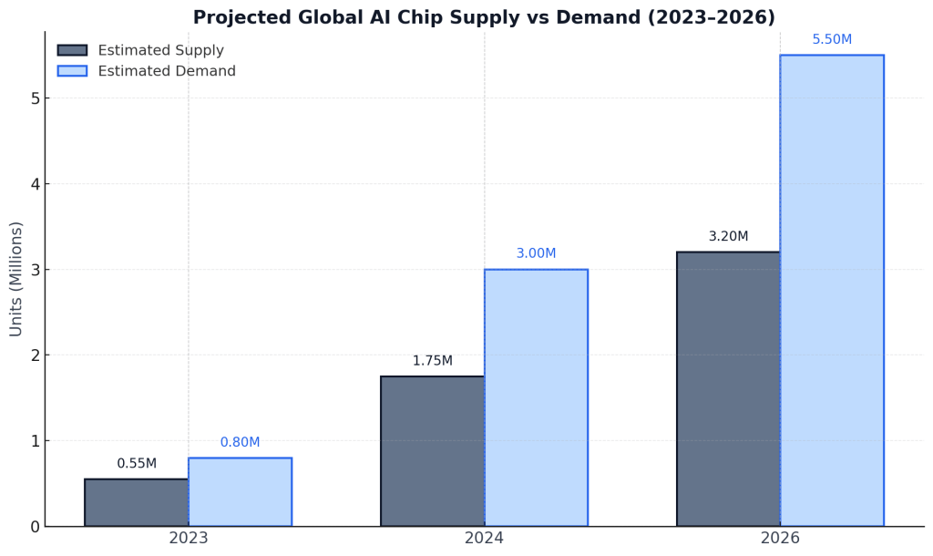 Demand for AI chips is outpacing supply with shortages expected to persist through 2026 despite rapid production growth. Sources: FT, McKinsey, Wells Fargo, TrendForce (2023–2024); projections extrapolated using ~30–40% CAGR in AI chip demand and ~25–30% CAGR in supply growth.