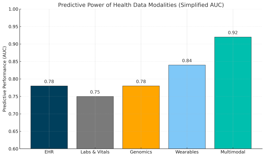 Footnote: AUC values shown here are illustrative mid-range estimates derived from published models across major datasets (e.g., MIMIC, UK Biobank, Apple Heart Study). Actual performance varies by disease, cohort, feature engineering, and prediction horizon. Typical ranges reported in the literature are: EHR 0.70–0.85, Labs/Vitals 0.70–0.80, Genomics 0.60–0.80, Wearables 0.80–0.90, and Multimodal 0.88–0.95. The purpose of this figure is to highlight relative predictive signal across modalities rather than task-specific precision.