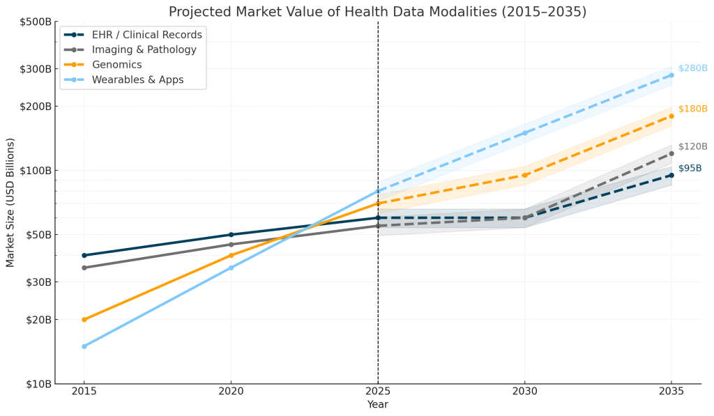 While legacy systems like EHRs continue a steady climb, imaging and genomics are accelerating, and wearables are set to dominate with estimated $280 billion in market value by 2035: