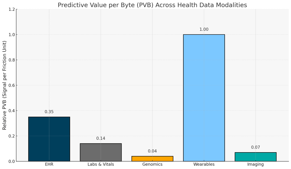 AUC is a representative task-level predictability estimate. AUC values used were: EHR = 0.75–0.80, Labs/Vitals = 0.72–0.78, Genomics (PRS) = 0.70–0.80, Wearables = 0.80–0.85, Imaging = 0.80–0.95.